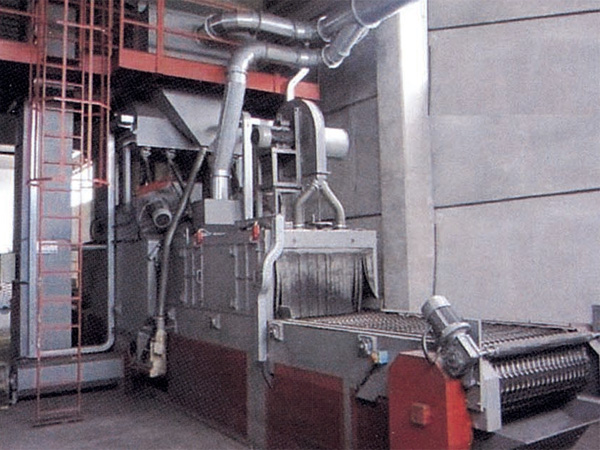 通過拋丸去除工件表面的銹層、焊渣及污物,使之獲得均勻一致的金屬光澤,提高了涂飾質(zhì)量與防腐效果。被清理件以自動(dòng)、連續(xù)不間斷方式通過拋丸區(qū),接受多個(gè)方向的拋丸清理,清理效果好,且有效避免工件相互碰撞而損傷。
